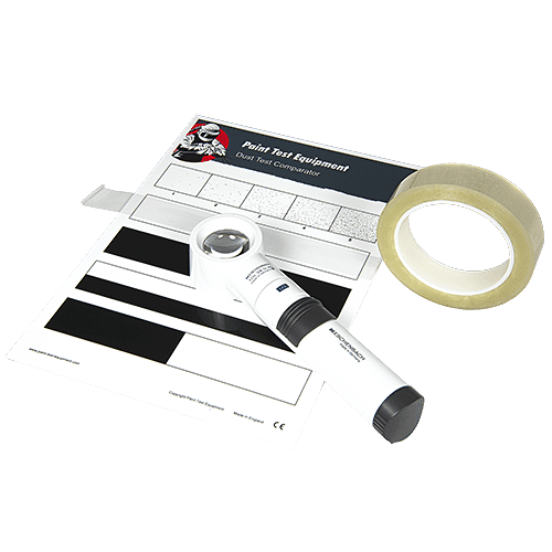Dust Tape TestDust Tape Test using the Dust Test Tape and Dust Test Comparator will allow you to assess the quantity and size of dust particles on blast-cleaned steel.Dust particles on blast-cleaned steel surfaces may reduce the adhesion of applied coatings, and by absorbing moisture may promote the corrosion of the steel surface.All items are supplied in an industrial Carrying Case with Dust Test Tape (60m), Dust Test Comparator and X10 Illuminated Magnifier. Compliant to ISO 8502-3. |